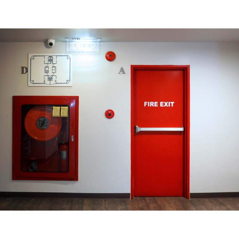 Certified fire-resistant door assemblies engineered to contain heat and smoke, protecting critical exit routes during emergencies.